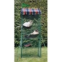 Allow your cat or kitten to relax in the fresh air, watch the birds, exercise and enjoy the sunshine without the risks of escape or injury with this netted cat shelter from Kittywalk. The vertical design is ideal for small apartment and condo balconies. Measuring 5 feet high, 2 feet wide, and 2 feet deep the unit offers 20 cubic feet of outdoor freedom. Three weatherproof hammocks let cats lounge up high. A weatherproof sunshade keeps cats cool and protects them from rain. Rip-stop collapsible netting with a sturdy steel frame ensures optimal durability for years of protection. The unit sets up quickly with 4 included support poles. The unit folds down smaller than a folding chair for easy trunk transport to the park, campground, or cabin. The purchase includes a handy storage bag. The Penthouse integrates with other Kittywalk components (available separately).